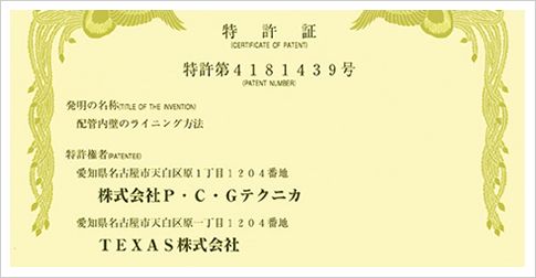 株式会社 P・C・Gテクニカは、名古屋市長賞を受賞し、排水管を既存状態のまま、廃棄物の発生抑制と防錆・耐震補強を兼ね備えた管更生技術を開発し、老朽化したマンションなどに応用することにより、省エネ・省資源に大きく貢献し、その将来性が高く評価されました。 ![]() ![]() その一つ、P・C・G耐震ライニング工法は、マンションやアパートの共用部分の排水管に行うライニングで、当社の特許です。工法についてわかりやすく例えるなら、「排水管のなかにさらに管をつくる工法」。汚れを落とした排水管のなかに、ウレタン樹脂をしみ込ませた「スーパータフネスクロス(防刃チョッキにも使用されるほどの強度を持った素材)」を通します。この際に「反転機」という機材を使って、反転させながら通すことで特許を取得しています。 試験によって30年分に相当する回数の洗浄を行っても変化しない強度が証明されています。