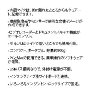 スタンド型で省スペース設計のデジタル書画カメラ-米国ベストセラーNo.1商品 HoverCamT3は、世界で初めてのUSBドキュメントカメラです。 過去の書画カメラで使用していたような 大きな光学部品を必要とせずに、USBカメラとPCのソフトウェアによりコンパクトで高解像度の表示ができるデジタル省スペースカメラを実現し、かつ低価格での提供を実現しました。 HoverCamT3は、PCとUSBで接続しますので電源はUSBバスパワーで動きます。 PCからプロジェクターや大型TVモニターに接続し、附属の専用ソフトウェアHoveCam Flexの機能により、様々なドキュメント表示ができます。 ![]() <新製品>ポケットサイズスキャナカメラ HoverCam Mini5 500万画素高解像度、世界最小のパーソナルスキャナカメラ HoverCam Mini5は、世界最小(収納時約18cm、160g)の500万画素のUSBスキャナカメラです。 ポケットサイズなのでノート型PCやMacと一緒に持ち運び、オフィスやユーザー先の会議やプレゼンテーション、出張時でもPCにUSBで接続し、モバイル環境での使用が可能なカメラです。 過去の書画カメラで使用していたような大きな光学部品を必要とせずに、USBカメラとPCのソフトウェアによりコンパクトで高解像度の表示ができるデジタル書画カメラを実現し、かつ低価格での提供を実現しました。 HoverCam Mini5は、PCとUSBで接続しますので電源はUSBバスパワーで動きます。 PCからプロジェクターや大型TVモニターに接続し、附属の専用ソフトウェアHoveCam Flexの機能により、様々なドキュメント表示ができます。 500万画素の解像度と16倍デジタルズーム・10倍光学ズームにより、A4版までの書類のスキャンが可能です。 ![]() 動画をご覧ください。