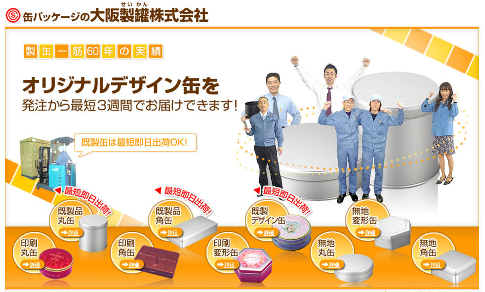 お菓子缶、のり缶、薬缶、WAX缶、芳香剤缶などオリジナル缶を企画製造販売。 ![]() ![]() http://www.osaka-seikan.co.jp/kan/index.html |