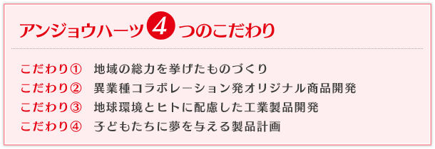 ![]() ![]() 「ものづくりの安城から、愛をこめて。」を理念に、様々な業種のメンバーが情熱的な話し合いを行っております。アンジョウハーツオリジナルジャンパーを着て一丸となって取り組んでおります。今後もアンジョウハーツのものづくり活動にご期待ください。 安城市は全国環境首都コンテストで第3位を獲得した環境都市です。リサイクル材を原材料とする環境配慮の 工業製品ブランドを創出し、技術と環境配慮の融合を図ることで「安城らしさ」を盛り込んでいます。 ■ キャップアートパネル (意匠登録番号第1450980号)