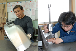 ![]() ★ アミヤの得意技術 積層金型やZAS型(ザス)を使っての『絞り加工』と、1枚の鉄板をハンマーで叩いて球面を成形する特種熟練技術の『叩き鈑金加工』とを組み合わせ、さらに『3次元レーザー』でトリミング、異形穴加工までを一貫した『複合鈑金加工』がアミヤの得意とする技術です。 製品の大小を問わず、加工の難易度を問わず、アミヤの鈑金技術はどこまでも挑戦し続けます。 積層金型&ZAS型で試作から量産まで !