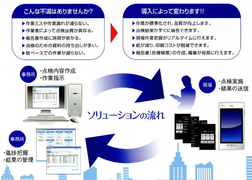 スマートフォンを活用し、様々な設備等の点検を効率良く行うお手伝いができるソリューションのご提案です。