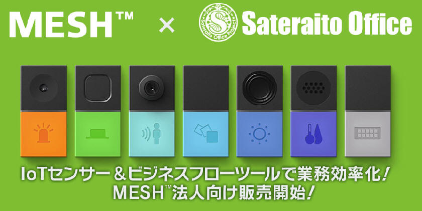 MESHタグ(IoTセンサー)と、MESHアプリ(ビジネスフロー作成アプリ)から構成され、企業の中で、業務効率化に利用が可能です! 例えば、会議室にIoTセンサーを配置し、空き状況&呼び出しが可能! 消耗品補充依頼/集荷依頼したい場合は、ボタン1発で依頼が可能!機密部屋など、人感センサーやドア閉開センサーでExcelにログ管理!取引先から定番商品を発注をボタン1つで!IoTセンサーと、各種クラウド(G