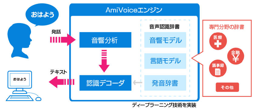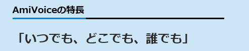 AmiVoiceは、世界トップレベルの音声認識技術を搭載し、実用的に、ビジネスや日々の生活に密着した多種多様なサービスへと反映することができます。 |