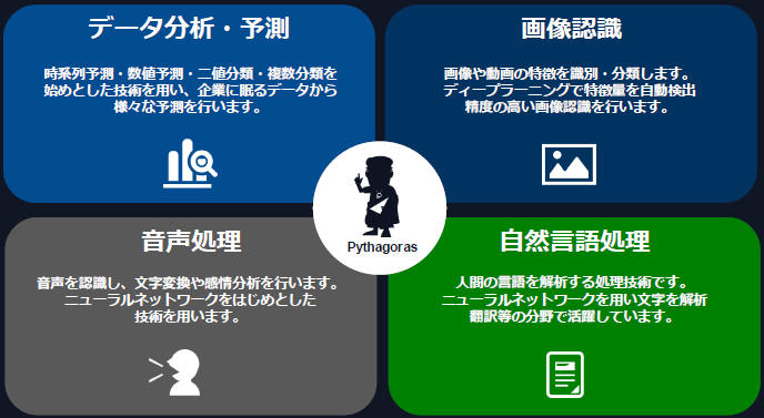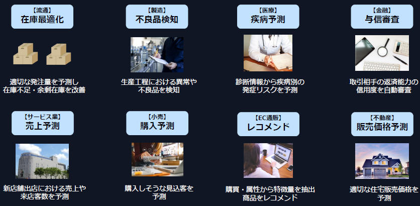 データ分析・予測、画像認識、音声認識、自然言語処理をはじめとした様々な領域で、